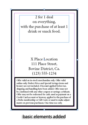 6. As you can see, in this InDesign tutorial I’ve placed the important info, but also left space for more decoration and design. Start rounding out your design to match the other side of the coupon.